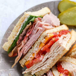 Our clubhouse sandwich is pan-pressed so the bread is toasted. filled with lettuce, tomato, meats, mayo, and mustard. With a pickle on the side.