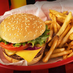 Our burger and fries come with a burger with the works on it, with crispy fries that are cooked to a lovely golden brown. You ask for different toppings on the burger if you don't like the works.