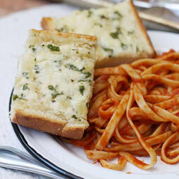 Our pasta is made with a homemade tomato sauce of our making with a hint of cheese on it. it comes with garlic bread on the side for dipping or just eating.