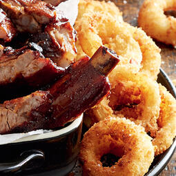 Our BBQ ribs are made on our BBQ cooked over a hot flame with BBQ sauce covering the meat. It's fall off the bone good. It comes with a side of onion rings that are very crispy cooked in hot oil.