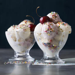 Our bowl of ice cream is chocolate or vanilla. comes with sprinkles and a cherry on top.